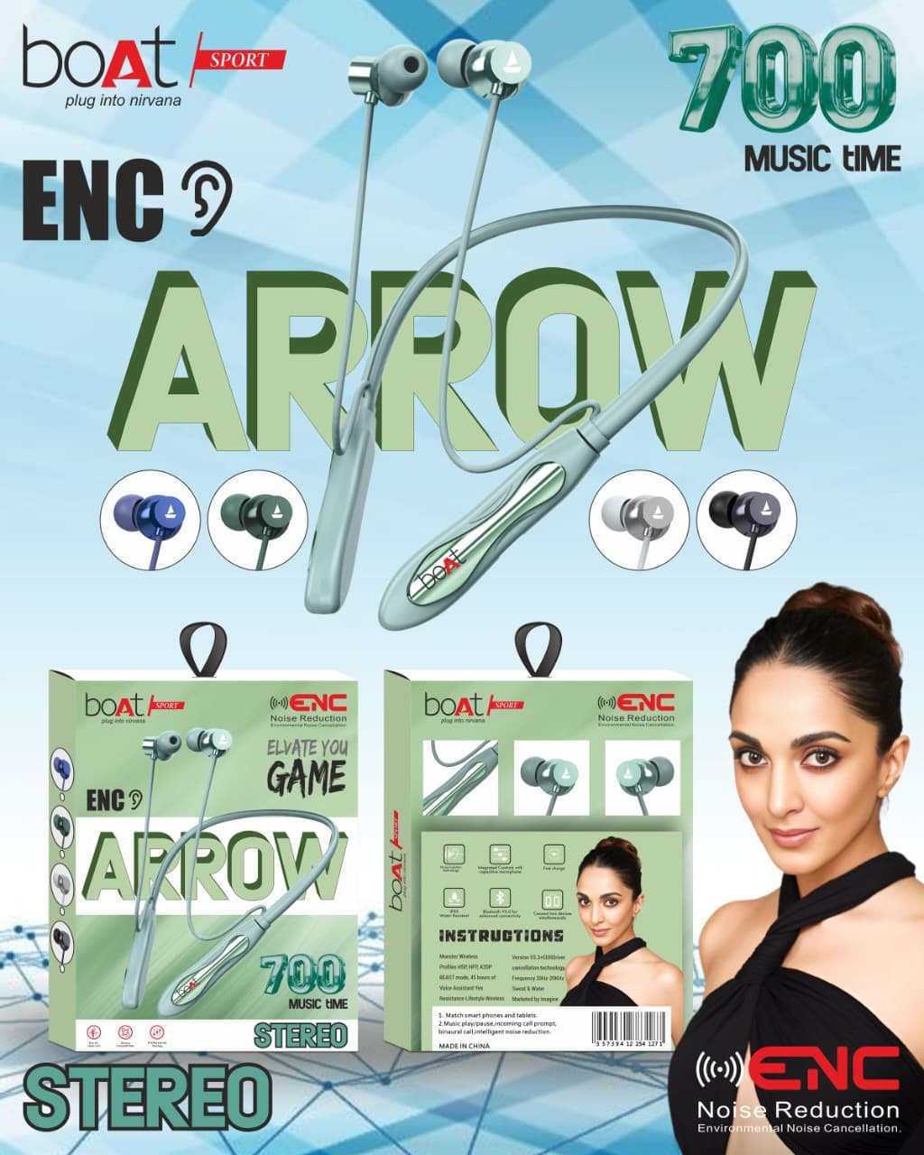 The image is an advertisement for boAt Sport’s “ARROW” neckband earphones. Here’s what we can see:
