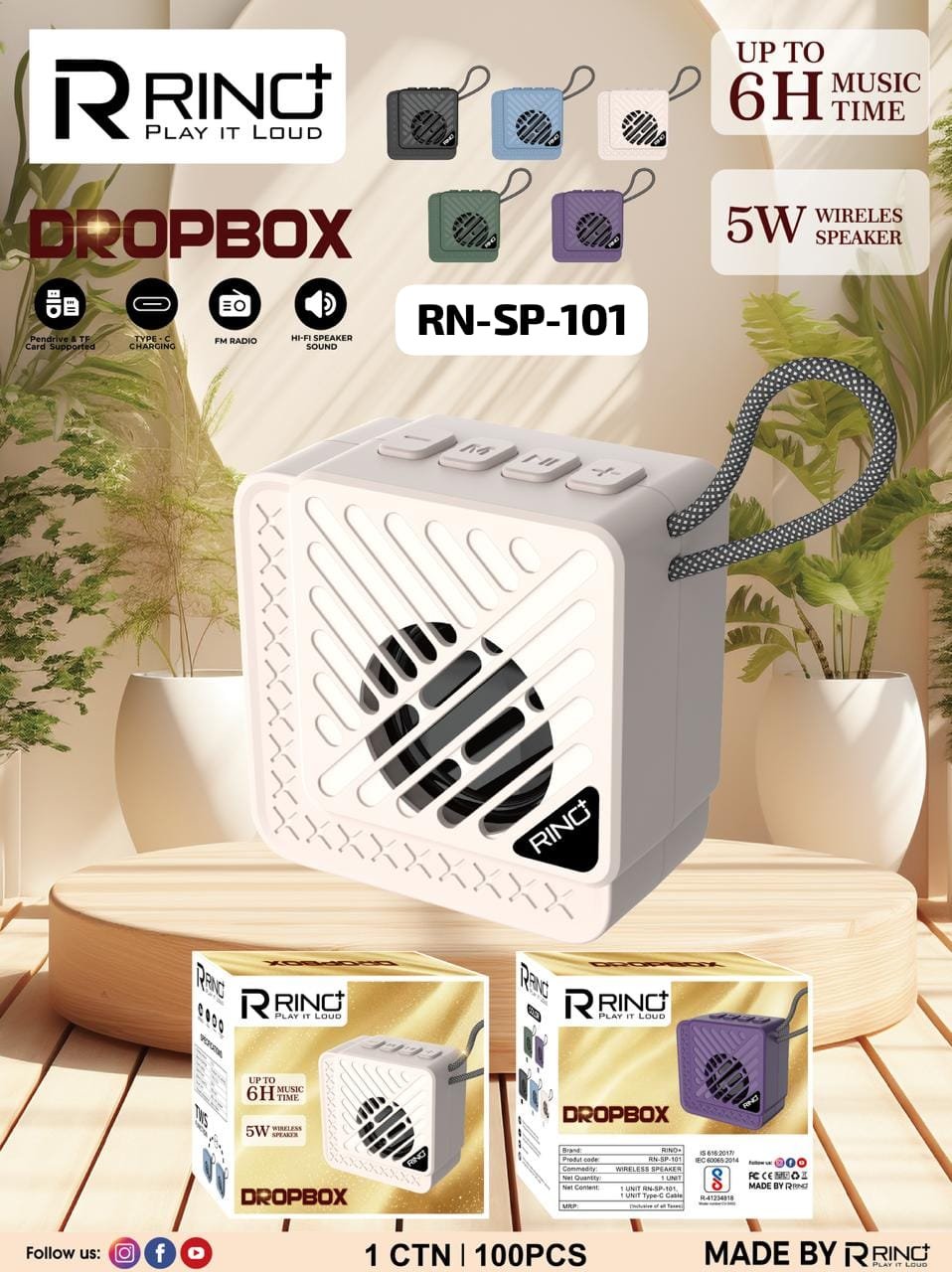 The product shown is the *RINO DROPBOX RN-SP-101*, a wireless speaker with these key features: