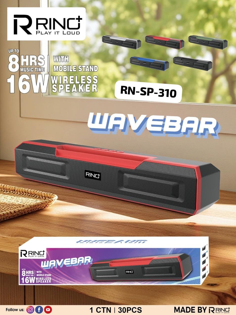 The product shown is the *RINO Wavebar RN-SP-310*, a wireless speaker advertised with the following features: